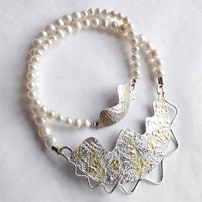 Returning to her Somerset home in 1990 Prue was excited to find the craft show scene. Starting in relatively small shows she was soon selling at shows throughout the south of England whilst developing the simple shapes that so characterise her work, at that stage in brass and, increasingly, silver. However, leafing through a craft magazine Prue was inspired by work using mixed metals and the lovely effect that could come out of that. Initially Prue was fusing small pieces of gold onto silver but one exciting morning an idea came into her head to use sheet gold pieces on the silver and to texture the whole piece. This technique continues to inspire and is used in much of Prue’s mixed metal work to this day.